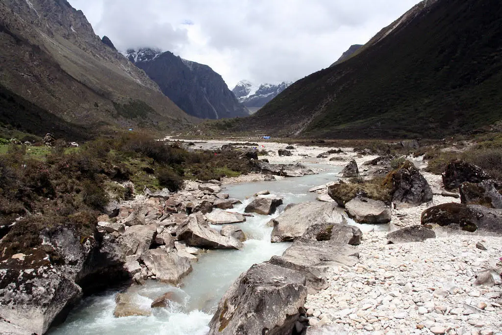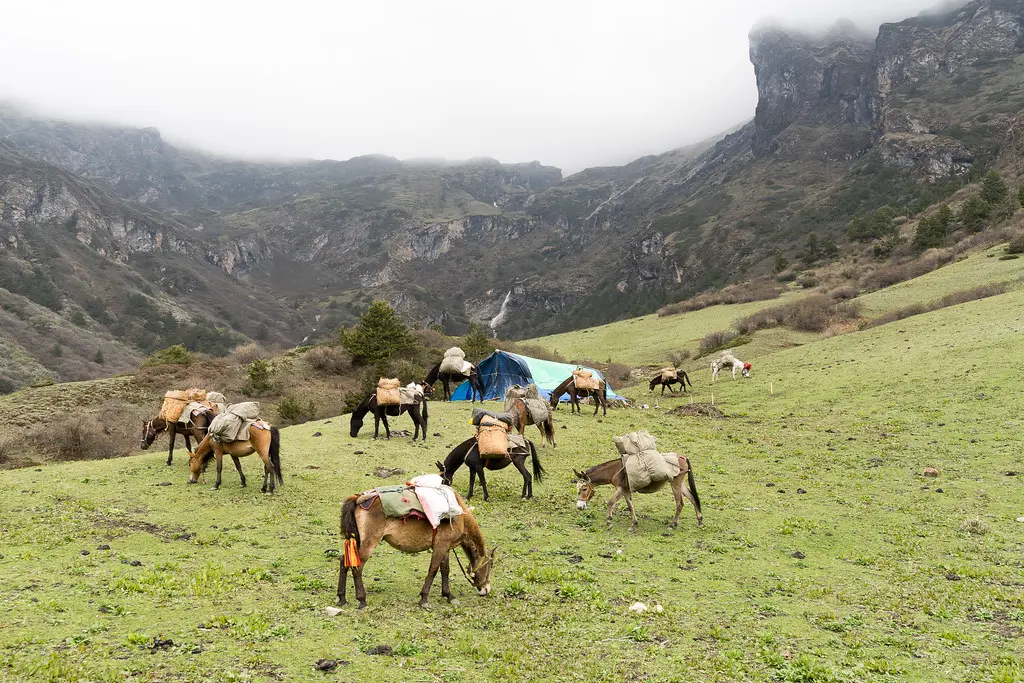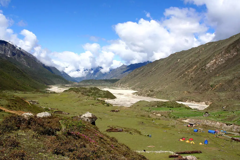A long but scenic day following the river through deep forests of oak, birch, and rhododendron. As you approach camp, the first glimpse of Mount Jomolhari (7,326m) may appear.
