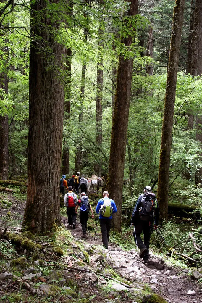 Trek: 7–8 hrs, 19 km, gradual climb through forest and alpine meadows